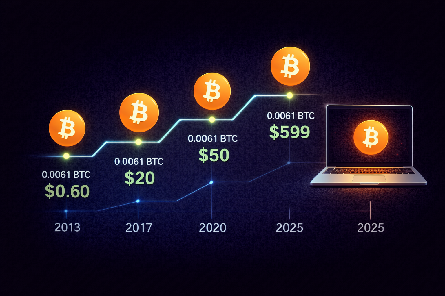 Hoy $599 = 0.0061 BTC (precio marzo 2025).