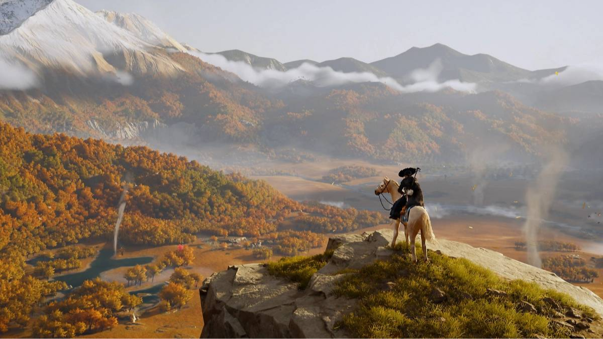 Visually, Ghost of Yotei embraces strong contrasts: golden fields against snow-covered landscapes, clear skies giving way to relentless storms, and the imposing silhouette of Mount Yōtei cutting across the horizon. All of this reinforces the feeling of wild beauty and constant danger.