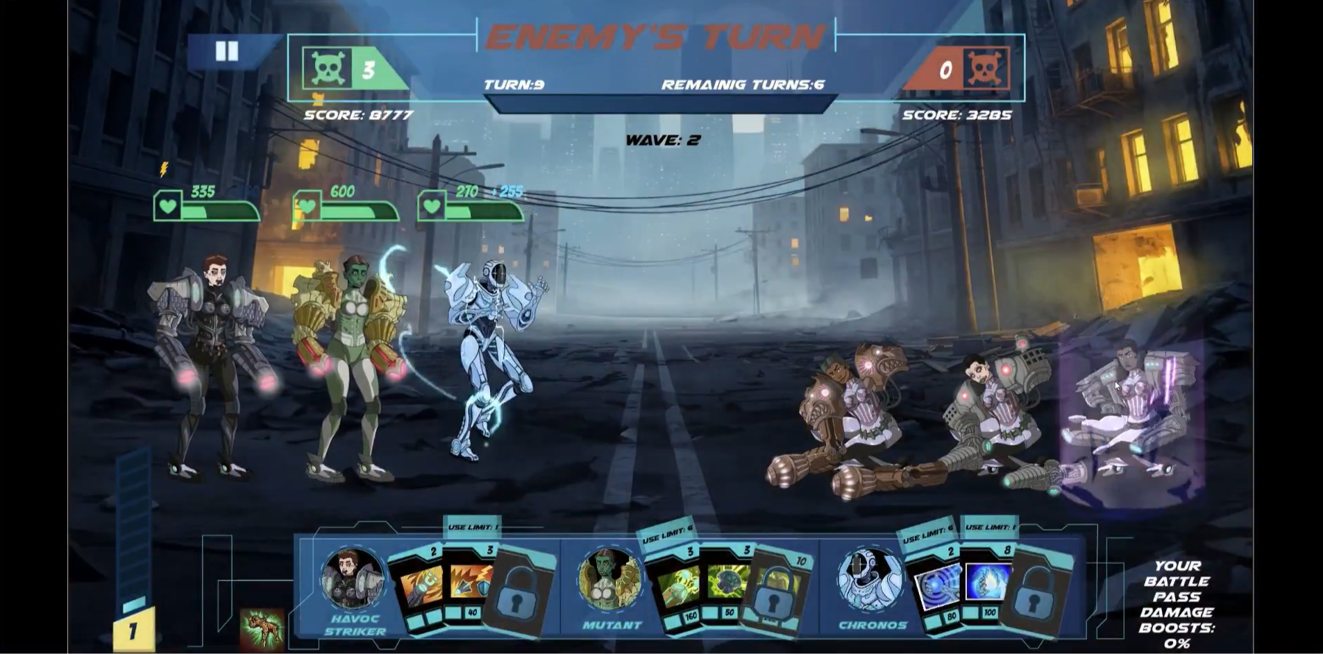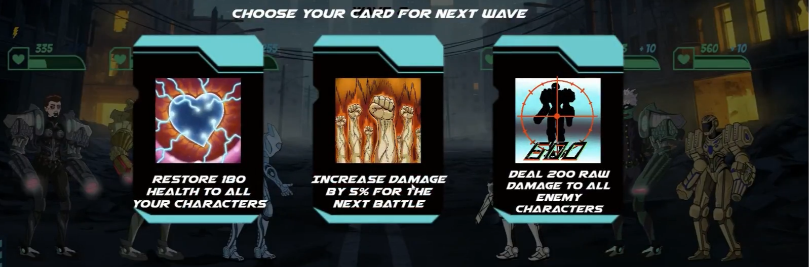 The core gameplay of NeuroGuardians consists of turn-based encounters between two players, each commanding a squad of three characters (Guardians). Every character has a set of cards that define their available actions — such as attack, defense, or special abilities.