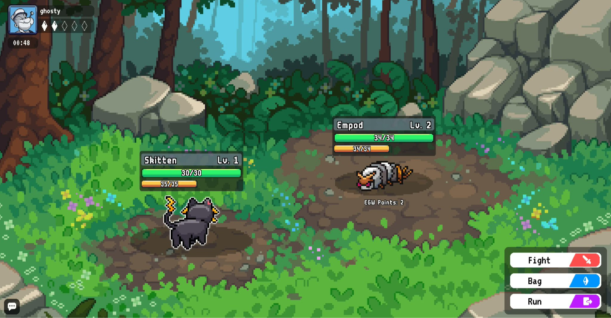 The game combines exploration, breeding, and turn-based battles, inspired by classics like Pokémon and Stardew Valley. At the start, players can choose one of three hunters — Atom (Luck), Bellatrix (Intelligence), or Cosmo (Charisma) — each offering unique bonuses that shape the adventure’s progression.