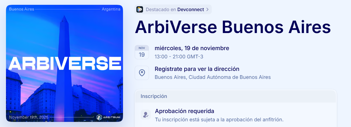 Arbitrum will host a new edition of ArbiVerse in Buenos Aires on November 19, alongside Devconnect. The event will bring together developers, communities, and projects from the ecosystem to showcase technological advances, share experiences, and strengthen on-chain adoption in the region.