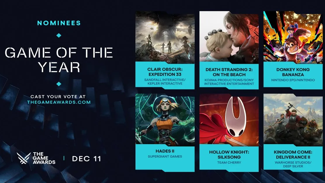 gotygame awards 2025juego del añoclair obscur expedition 33death stranding 2 on the beachdonkey kong bananzahades iihollow knight silksongkingdom come deliverance iisandfall interactivekojima productionsnintendo epdsupergiant gamesteam cherrywarhorse studios