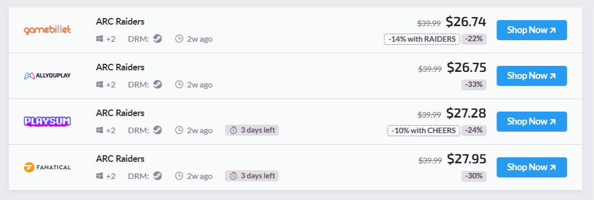 For those looking to compare prices across different digital stores, GG.deals compiles the main active offers for ARC Raiders. Through this platform, users can check price differences between official stores and authorized resellers, regional or platform-based variations, and the game’s price history.