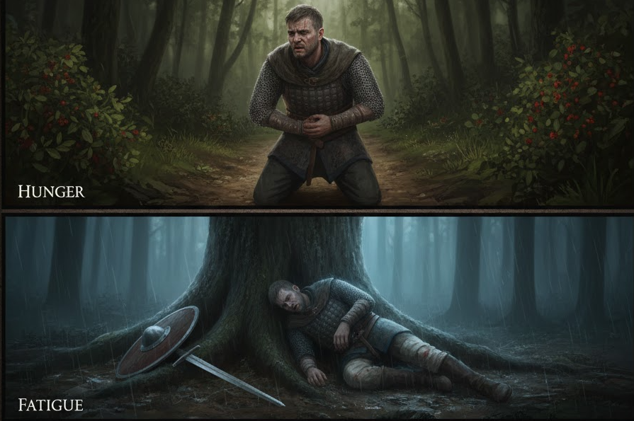 Within the game system, hunger, fatigue, and injuries are not secondary indicators. Each one affects statistics such as stamina, regeneration, and combat effectiveness.