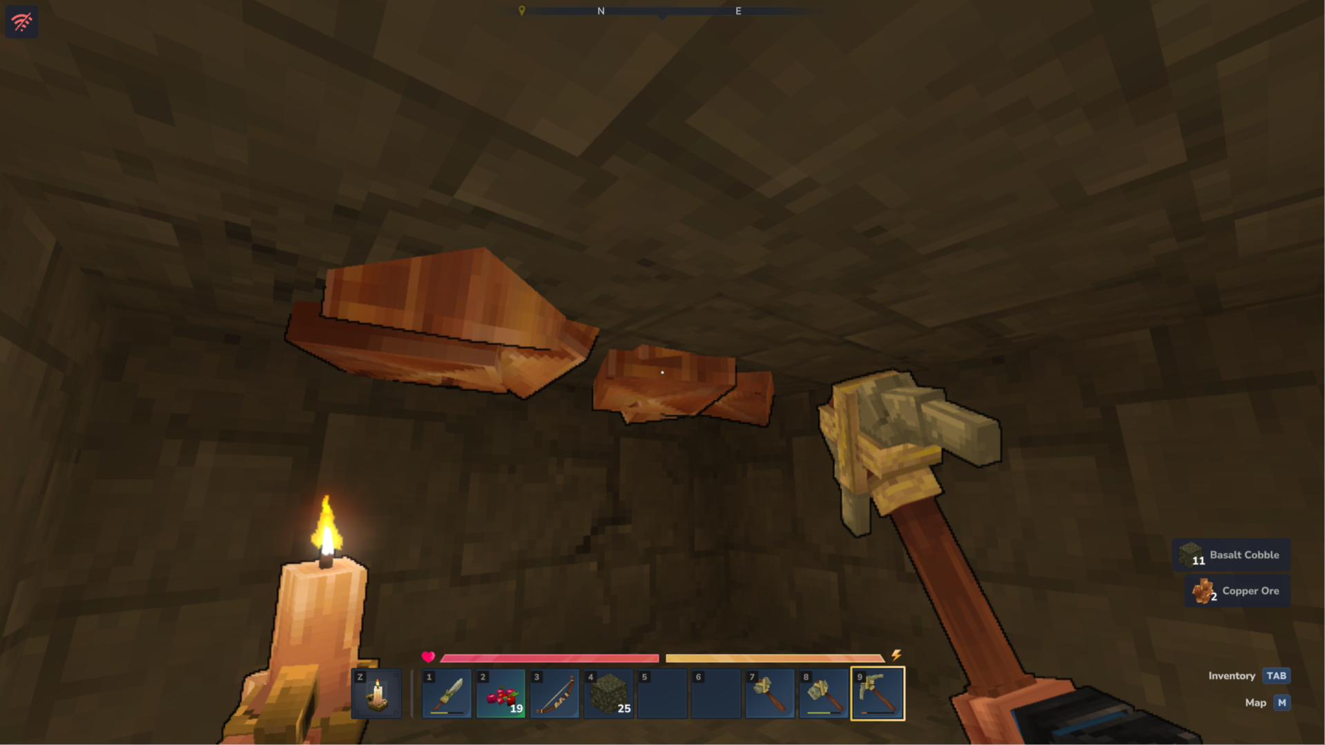It commonly appears in caves near the starting area, especially in forest and desert biomes. It can be mined with a basic pickaxe and is found in visible veins on rocky surfaces. Its main use is crafting early-game tools and upgrading basic workstations.