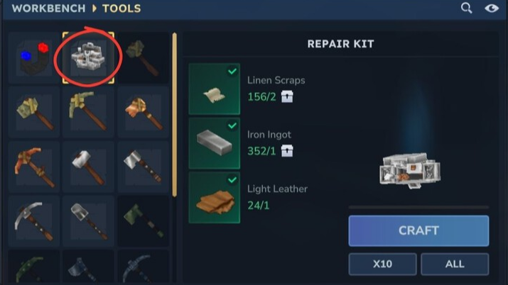 Once crafted, the Repair Kit must be equipped in your hand. By right-clicking, a menu will open showing all the items in your inventory that can be repaired.