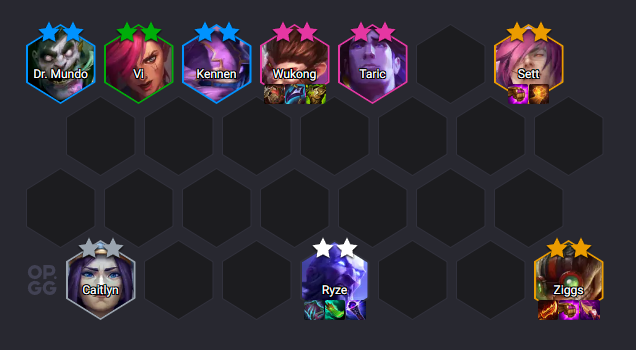 This composition relies on an early Yordle start and Ability Power (AP) items. The player should transition through Yordles and later build a solid frontline with Dr. Mundo, Wukong, and Taric, eventually unlocking Sett. The backbone of the early-game synergy comes from Kennen, who becomes effective once the Yordles reach two stars.