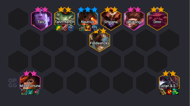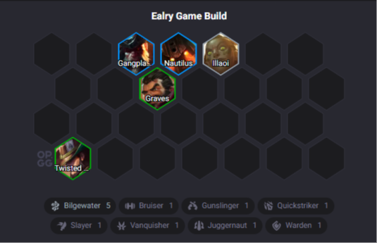 A standard composition that depends on getting Twisted Fate early, equipping him with items, and starting to generate “snakes,” which allow you to buy exclusive Bilgewater champions and items. The key is to quickly activate the first three Bilgewater units using Graves and Illaoi alongside TF.