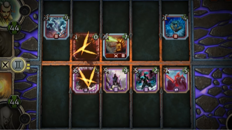 Cards are placed on a five-lane board, where creatures face each other directly. If a lane is empty, the attack hits the opposing player instead.